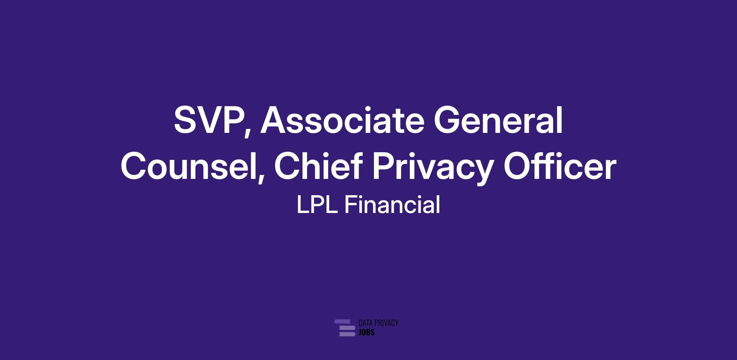 The Legal Department at LPL Financial is looking for an attorney to serve as the Chief Privacy Officer (CPO) and Senior Vice President, Associate General Counsel of the firm. This attorney will be a visible leader across LPL, providing advice on legal and policy issues relating to privacy, technology development, cybersecurity and incident response, data governance, and artificial intelligence (AI) matters. The role will work with and lead an experienced team of lawyers to provide pragmatic legal advice and thought leadership.